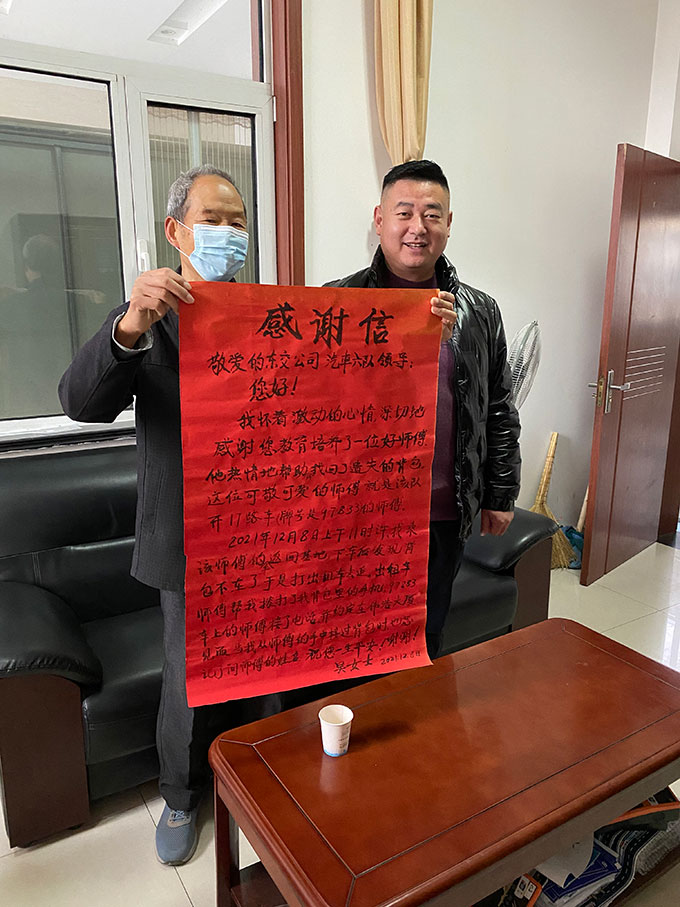 12月9日上午,東營市公交公司汽車六隊(duì)的辦公樓里來了兩位手捧大紅色感謝信的老人家。上面寫著“感謝您教育培養(yǎng)了一位好師傅,他熱情地幫助并找回了遺失的背包。”