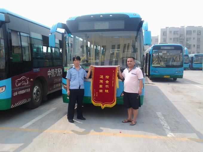 2013年8月15日,在東營(yíng)市公路局工作的石忠軍師傅為公交駕駛員李長(zhǎng)征送來了一面“拾金不昧、品德高尚”的錦旗表示感謝。