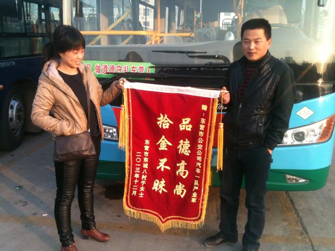 2013年12月5日,東城八村乘客于小梅女士拿著一面寫有“拾金不昧、品德高尚”的錦旗來(lái)到市公交公司汽車一隊(duì),感謝車隊(duì)嚴(yán)業(yè)軍師傅拾金不昧的高尚品德。