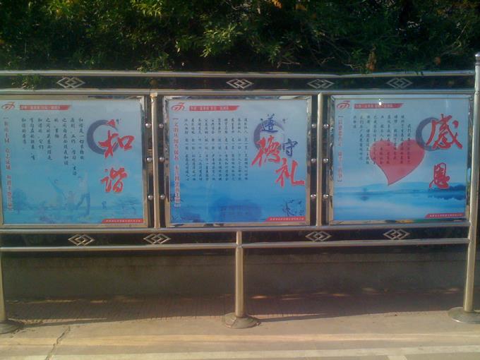 8月24日下午,市公交公司汽車三隊經(jīng)過多日熟思審處,精心構(gòu)思后制作的六幅展板安置在辦公樓前東側(cè)的不銹鋼宣傳櫥窗內(nèi)。