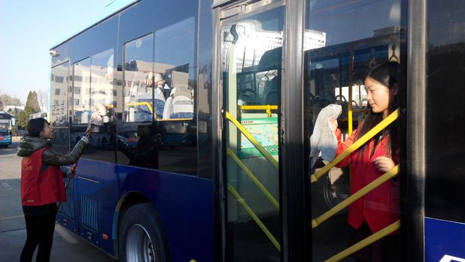 來自東營市職業(yè)學校會計學院的大學生和市公交公司汽車一隊職工共計24人,分兩個小組,一組乘坐公交車上路為特需乘客服務,幫助疏導乘客,另外一組幫助駕駛員擦拭公交車,清掃車廂衛(wèi)生。大家工作起來井然有序,有條不紊,尤其活躍在車廂為乘客服務的志愿者們,更是得到了乘客的一致好評,成為公交車上一道靚麗的風景。