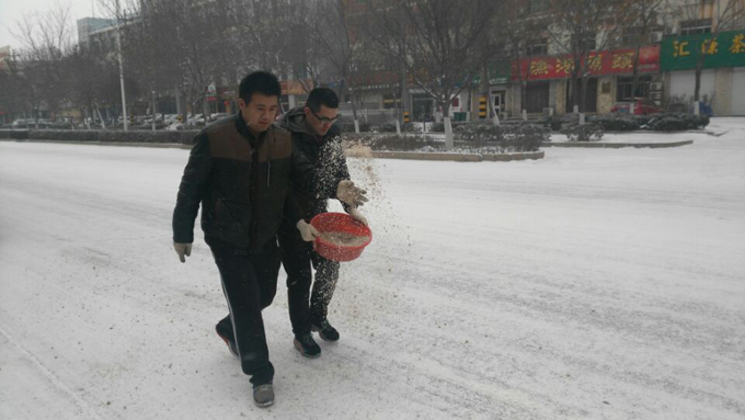 公交站點(diǎn)傾灑融雪劑 保障公交車(chē)出行順暢