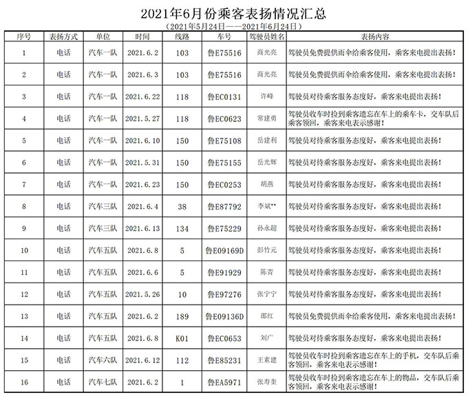近段時(shí)間以來(lái),廣大駕駛員按照公司的部署,在做好疫情防控的同時(shí),積極投身公交服務(wù)質(zhì)量提升工作。經(jīng)過持續(xù)不斷的努力,公交服務(wù)質(zhì)量明顯提高,涌現(xiàn)了一大批的好人好事,受到乘客的好評(píng)。為繼續(xù)提高工作積極性,形成“比、學(xué)、趕、幫、超”的良好氛圍,現(xiàn)將2021年5月24日至2021年6月24日期間通過公交服務(wù)熱線受到乘客表?yè)P(yáng)的駕駛員予以通報(bào)。