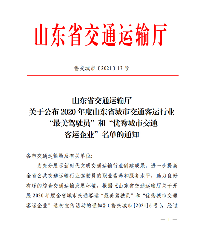 為充分展示新時(shí)代文明交通運(yùn)輸行業(yè)創(chuàng)建成果,進(jìn)一步提高全省公共交通運(yùn)輸行業(yè)駕駛員職業(yè)素養(yǎng)和服務(wù)水平,助力良好有序的綜合交通運(yùn)輸發(fā)展環(huán)境,根據(jù)《山東省交通運(yùn)輸廳關(guān)于開展2020年度全省城市交通客運(yùn)“最美駕駛員”和“優(yōu)秀城市交通客運(yùn)企業(yè)”選樹宣傳活動(dòng)的通知》(魯交城市〔2021〕6號)要求,經(jīng)活動(dòng)啟動(dòng)、材料申報(bào)、資格審查、公開公示、人選推薦、專家評審等環(huán)節(jié),產(chǎn)生了優(yōu)秀城市交通客運(yùn)企業(yè)和城市交通客運(yùn)最美駕駛員名單,市公交公司及兩名駕駛員榜上有名。
