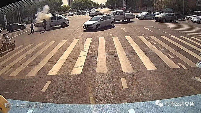7月15日15:40分左右,東營市公交公司汽車四隊張學成師傅駕駛152路公交車行駛至北一路與西二路路口等紅燈時,發(fā)現前方一輛私家車后斗著火,火苗竄得很高。張師傅見狀急忙拿著車內滅火器跑下車去,對著著火處進行滅火。