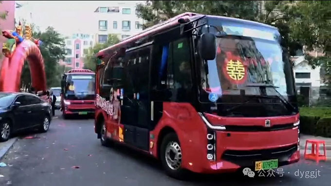 這兩輛公交車跟隨著迎親隊伍,高調(diào)得“秀恩愛”,吸引了無數(shù)的目光和祝福。寬敞的車廂,可以輕松容納一眾親朋好友,笑聲、祝福聲此起彼伏,為新人的幸福時刻,增添了更多的溫馨色彩。