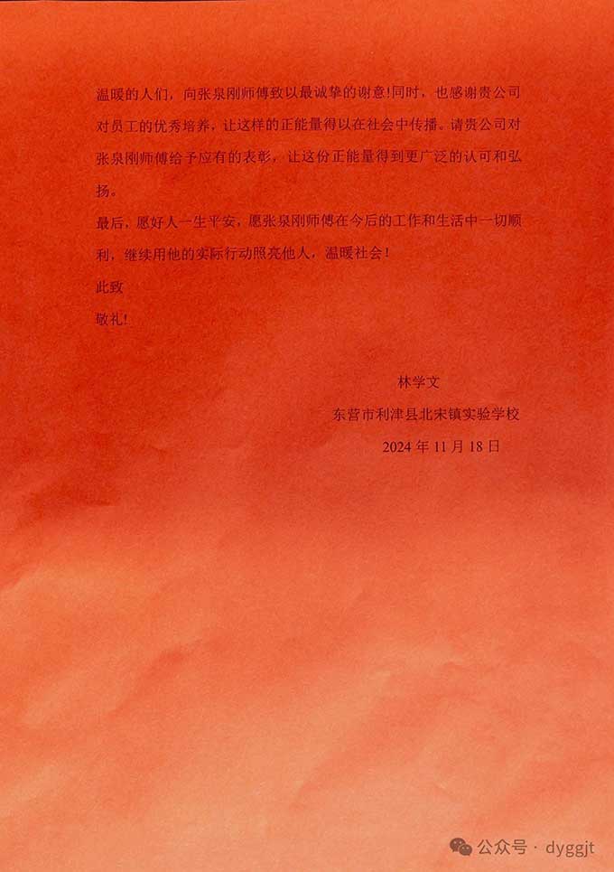 最后,林先生衷心祝愿張泉剛師傅在今后的工作和生活中萬事順遂,希望他一如既往地用實際行動照亮他人,溫暖社會。