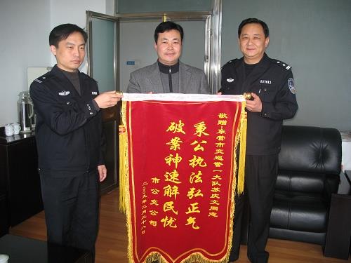 3月2日,為感謝交警部門秉公執(zhí)法,伸張正義,市公交公司委派汽車一隊(duì)的兩位隊(duì)長向事故處理中心干警蘇慶文同志贈(zèng)送了“破案神速解民憂,秉公執(zhí)法弘正氣”的錦旗。