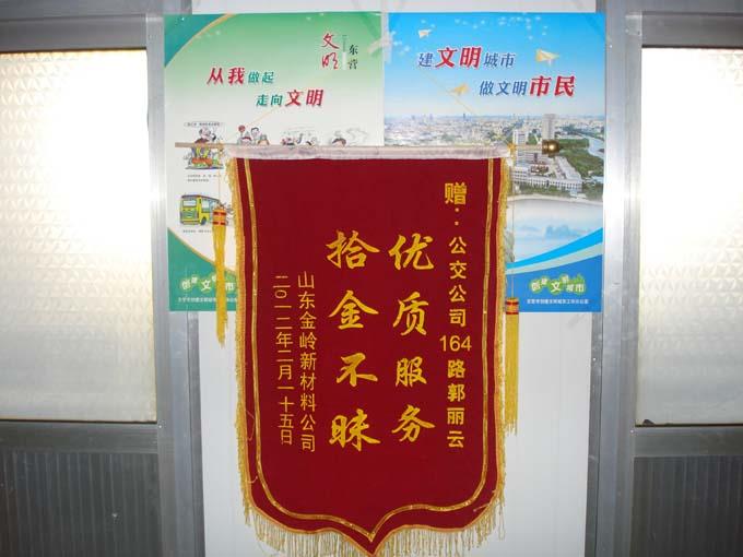 這位小伙子名叫燕同意,是山東金嶺新材料公司的一名職工,2012年2月15日上午,剛下了早班的燕同意乘坐8:40的164路返回東城,下車時將錢包落在了公交車上。跑回東城的駕駛員郭麗云在打掃車輛衛(wèi)生時看到了一個棕色的牛皮錢包,里面3000多元現(xiàn)金,4張銀行卡,1張銀聯(lián)卡,1張身份證。面對鼓鼓的錢包,郭麗云第一時間將錢包交到了車隊。并與車隊工作人員一起通過包內(nèi)的卡片多方聯(lián)系,在短短不到半個小時內(nèi)便將錢包送到了失主的手中。小燕問駕駛員名字,郭麗云卻怎么也不肯告訴他。小燕通過多方打聽才知道了她的姓名。時隔多日,小燕帶著感激的心情送來了一面寫有“優(yōu)質(zhì)服務、拾金不昧”的錦旗。