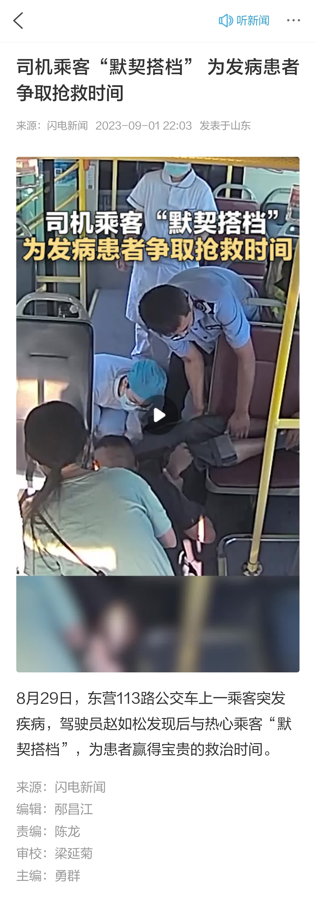 2023年8月29日下午4點58分左右,正在駕駛113路公交車的趙如松聽到了車內(nèi)乘客的呼救。他從車內(nèi)后視鏡看過去,發(fā)現(xiàn)車內(nèi)一男性乘客正在渾身抽搐,然后倒地不起,此時,坐在他后方的一名乘客見狀,立馬跑到駕駛員旁邊呼救。趙如松師傅馬上靠邊停車,并上前查看乘客情況,因接受過急救培訓(xùn),趙師傅立馬判斷,該乘客可能是突發(fā)疾病,在向公司匯報并征得車內(nèi)乘客同意后,立即將公交車開往醫(yī)院,為患者爭取急救時間。車輛到達(dá)到市人民醫(yī)院南門后,趙如松和急救人員合力將患者抬到急救擔(dān)架上,一起送到急救室,看著他情況穩(wěn)定后,才返回工作崗位駕車駛離。